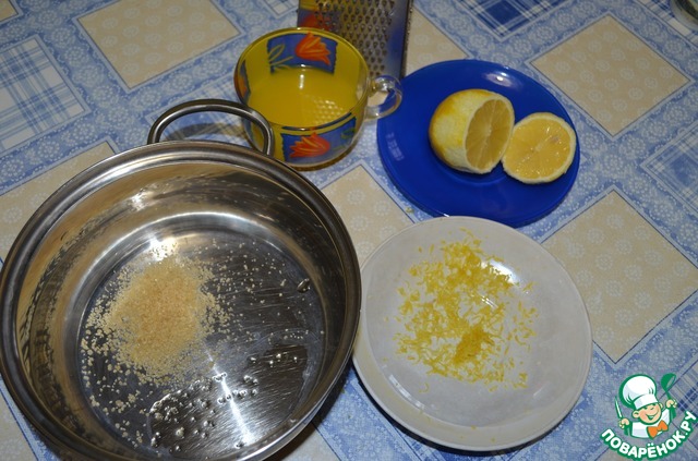 Готовим заливку для верхнего коржа. Трем на терке цедру, выжимаем сок половины лимона, нагреваем, добавляем сахар. Желатин готовим как обычно.