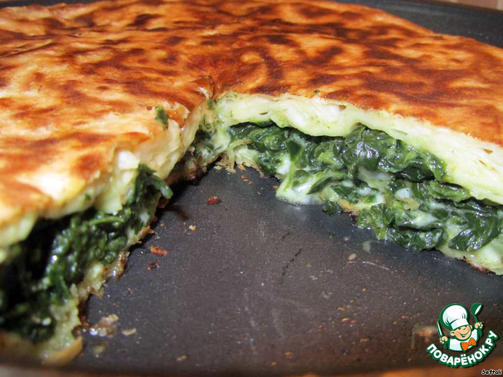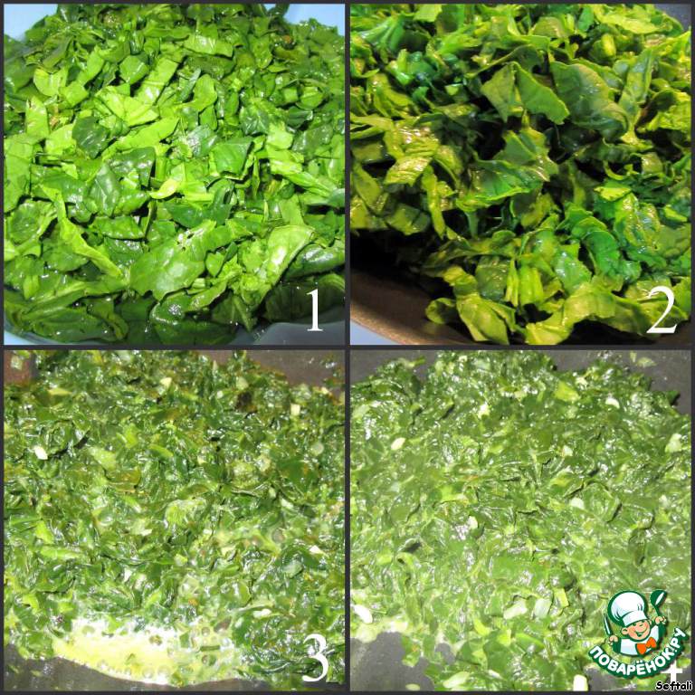 Шпинат моем, режем, замачиваем на полчаса, отжимаем и тушим с луком, чесноком и со специями до тех пор, пока вода не испарится.