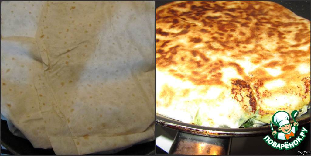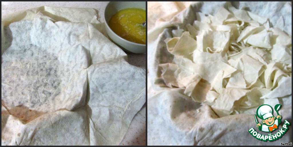 Кладем на сковородку лист теста, на него кладем порванный второй лист теста.