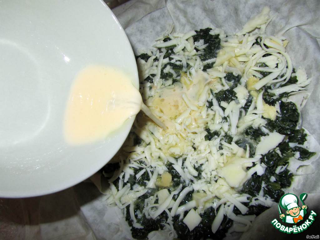 Кладем начинку, посыпаем сыром и заливаем взбитым яйцом с молоком и маслом.