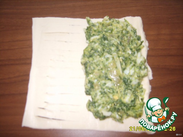 Нарезанный прямоугольный лист теста мысленно разделить на две части и на второй половине, сделать перпендикулярные надрезы.
