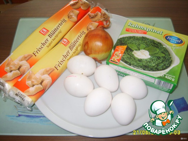 Мелко нарезанную луковицу обжарить со шпинатом.5 яиц отварить. Сыр и яйца натереть на крупной терке и добавить к шпинату. Посолить по вкусу.