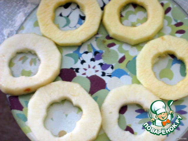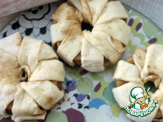 Соединить вместе один кружочек груши и яблока и обмотать полоской теста по кругу (пропуская полосочку через дырочку).