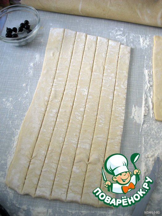 Тесто немного раскатать вдоль (в одном направлении, чтобы не разрушить структуру), нарезать на тонкие полосочки (шириной 1 см).