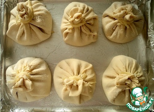 Выкладываем все узелки на подготовленный смазанный маслом или, как у меня, на заранее застеленный фольгой и так же смазанный лист. Протыкаем каждый узелок в нескольких местах зубочисткой или вилкой (чтобы выходил лишний пар) и в разогретую печь, на 30-40 минут, t выпекания 180 - 200 ºС. Если увидите, что узелки стали очень подрумяниваться - уберите жар в печи.