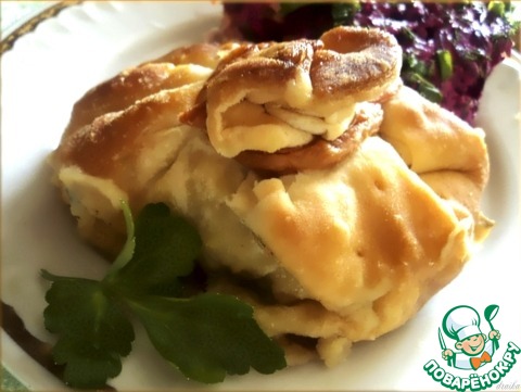 Переходим к тесту. Раскатываем его в тонкий пласт, тоже аккуратно и нежно, примерно толщиной 0,5 - 0, 7 см - не больше. Режем его на квадратики размером окого 11Х11 см. На средину каждого квадратика выкладываем картофельное пюре с грибами - 1,5-2 ст. л. Сверху выкладываем порционный кусочек окорочка, собираем всё тесто в узелок.