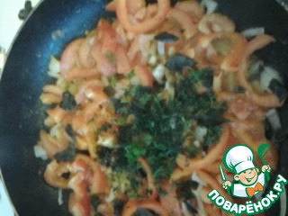 2. Овощная. Помидоры 2 шт. (без кожицы), лук, перец резать как вам больше нравится, зелень, базилик, соль.