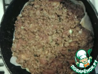 Опять укладываем листы на них выкладываем оставшуюся мясную начинку и посыпаем сыром.