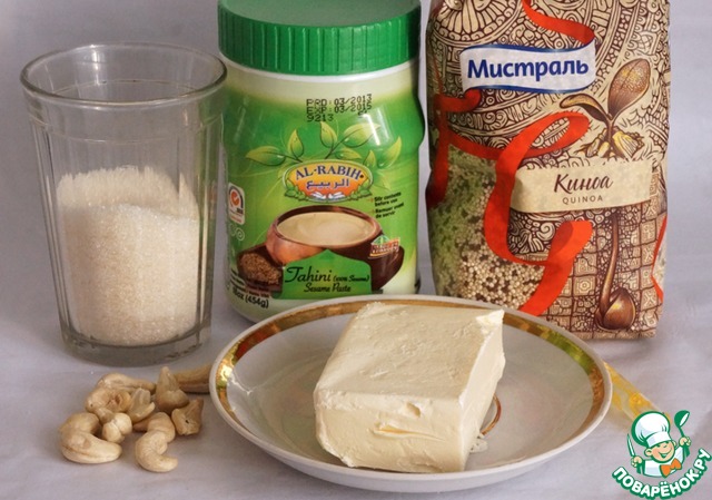 Подготовим нужные нам продукты. Масло должно быть холодным. Орехи для украшения можно брать любые, я использовала кешью. Кунжутная паста у меня готовая, но можно сделать и самим, на сайте есть рецепты.
