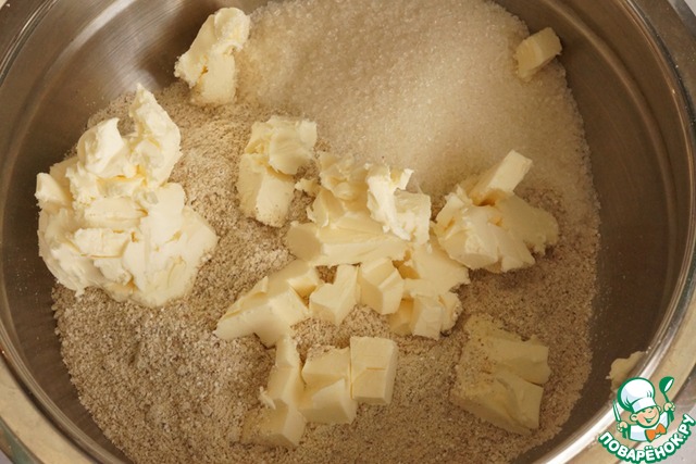 К муке из Киноа добавляем нарезанное кубиками сливочное масло, сахар и с помощью вилки растираем в крошку.