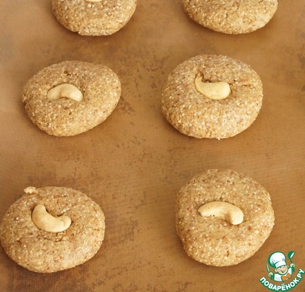 Далее, смоченными в воде руками формуем шарики величиной с крупный грецкий орех, выкладываем их на противень застеленный пергаментом или тефлоновым листом, вдавливаем сверху по одному орешку и отправляем в разогретую до 200 градусов духовку на 20-25 минут. Не передержите, так как печенье не становится золотистым, лишь слегка темнеет.