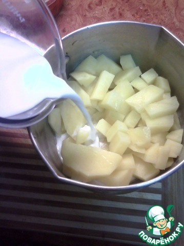 Влить сливки и варить на среднем огне до мягкости картофеля (20-25 мин). Снять с огня, излишек жидкости слить, охладить и размять картофель вилкой