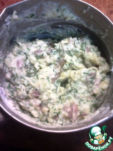 Добавить к картофелю укроп и рыбу, перемешать, посолить и поперчить по вкусу.