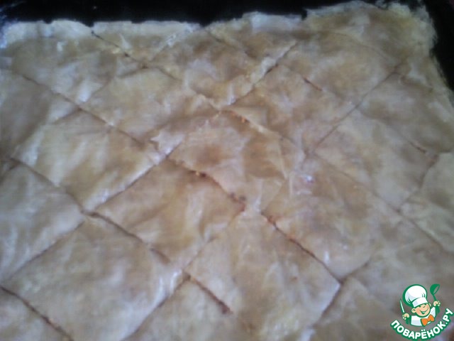 После того, как положили последний лист теста, острым ножом разрезать баклаву на ромбы, смазать сливочным маслом и поставить в духовку при температуре 200 градусов на 20 минут