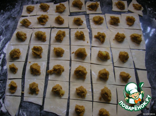 Тесто раскатать, нарезать квадратиками(или как вы привыкли).