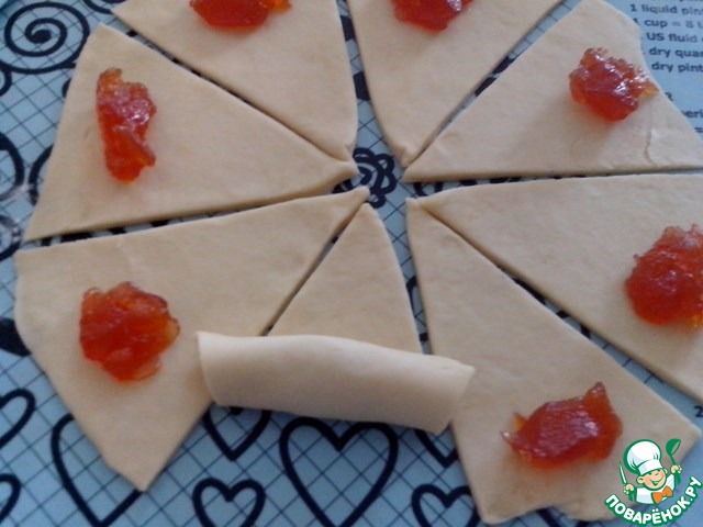 Тесто разделить на 4 равные части. Каждую часть раскатать в круг (толщиной 0,5 см), разрезать на сегменты. Выложить на каждый сегмент повидло. Свернуть рогалик от широкой части к узкой.