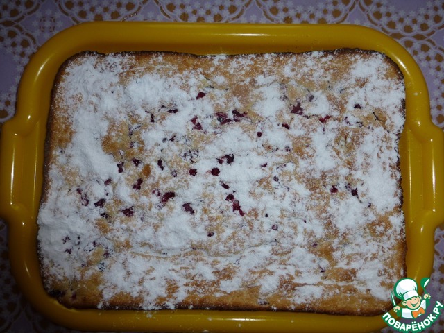 Готовый пирог выкладывают на блюдо, посыпают сахарной пудрой и охлаждают.