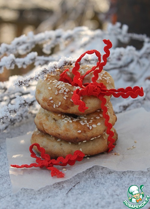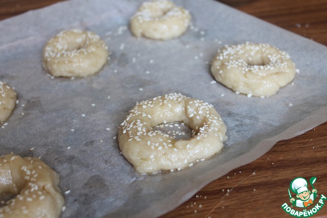 Духовку разогреть до 180-200 градусов. Противень застелить пергаментом. Тесто разделить на 12 одинаковых кусочков, скачать из них колбаски и свернуть в колечки. Тесто очень податливое, к рукам не липнет. В неглубокой тарелке смешать жидкий мед и желток, тщательно перемешать и аккуратно смазать поверхность бубликов. Присыпать кунжутом и отправить в духовку на 20-25 минут. Они должны подрумяниться.