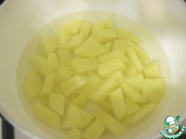Одну крупную картошку почистить, порезать, отварить в небольшом количестве воды.