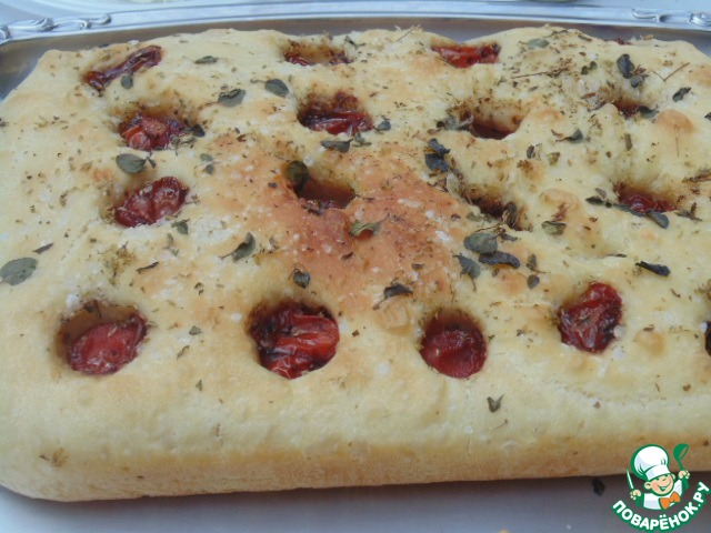 Тесто перекладываем в смазанную форму (моя форма размером 35*25), вдавливаем помидорки в тесто, посыпаем орегано сухим или свежим, посыпаем щепоткой крупной морской солью, поливаем оставшимся оливковым маслом.