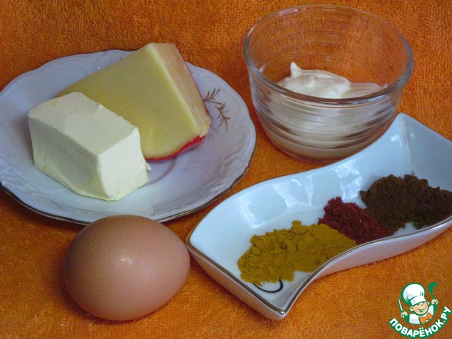Cмешаем размягченное масло с натертым на крупной терке сыром, яйцом, сметаной, сахаром, мукой и пряностями.