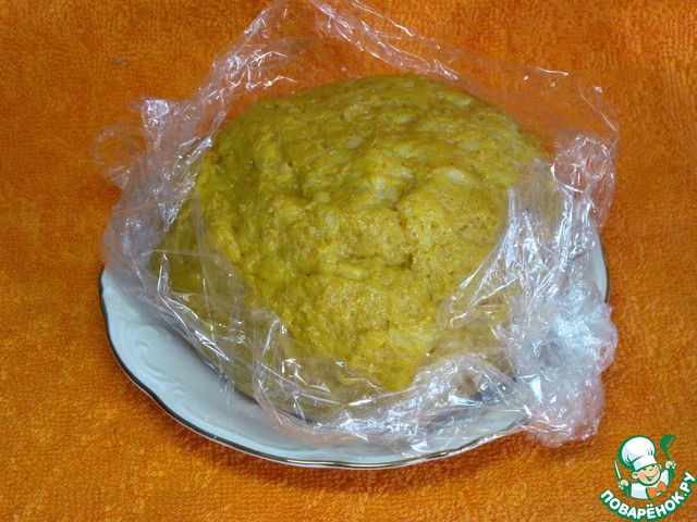 Произведем замес теста, завернем его в пленку и поставим на 1 час в холодильник.
