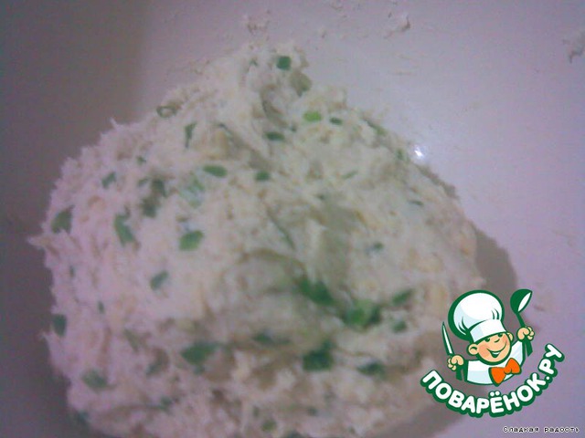 Зелень мелко порубить и добавить вместе с сыром в миску с мукой. Перемешать.