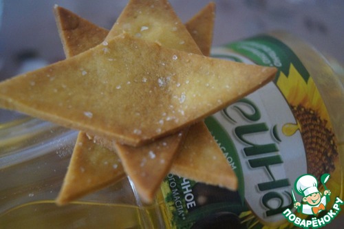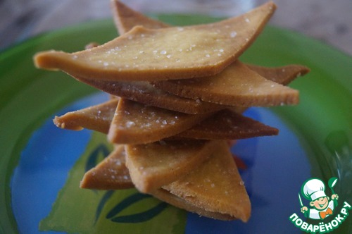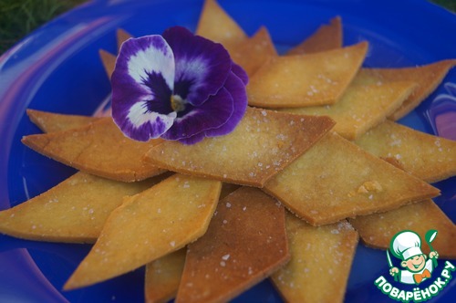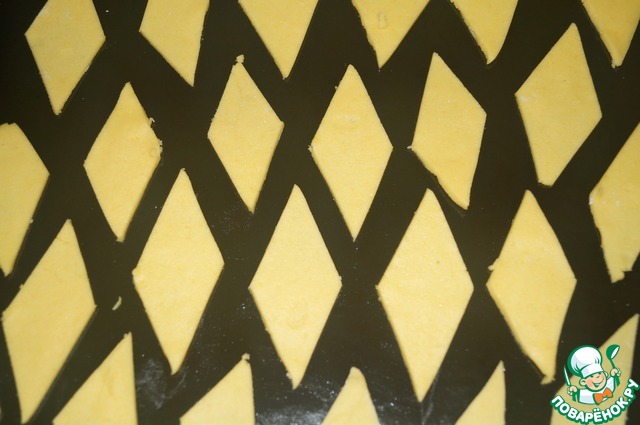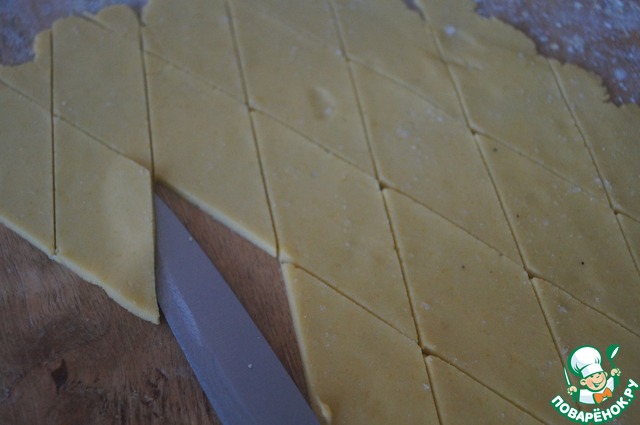 Раскатать тесто в тонкий пласт и ножом нарезать из него ромбы. Посыпать их крупной солью и немного придавить её рукой. (если вы хотите сладкое печенье, посыпайте его сахаром)