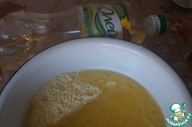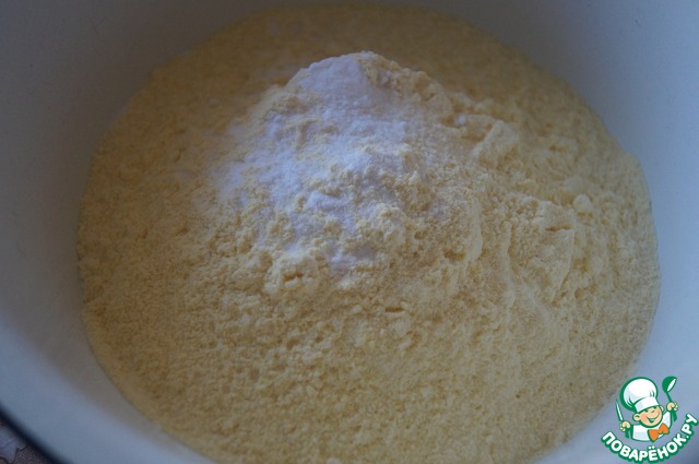 Перемешать кукурузную и пшеничную муку вместе с содой.