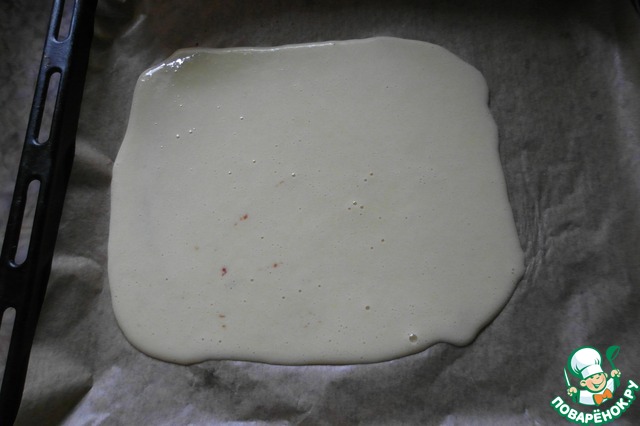 3. На противень положить пергамент и смазать его подсолнечным маслом. Равномерно распределить на нем тесто и поставить выпекаться в разогретую духовку. Выпекаем всего 8 минут, пока верх коржа не приобретет золотистую корку.