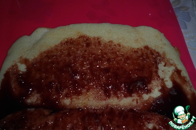 5. Снимаем с огня джем и достаем из духовки корж. Смазываем одну сторону теплым джемом.