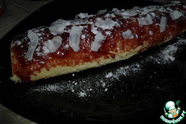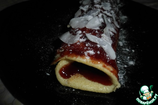 6. Заворачиваем в рулет, сверху тоже смазываем джемом, украшаем кокосовыми кранчами (в ингредиентах нет, потому что каждый украшает по своему вкусу) и обильно посыпаем сахарной пудрой.