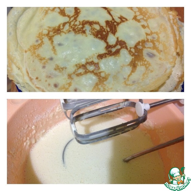 Блинчики можете сделать по своему любимому рецепту или воспользоваться моим, главное, чтобы блины были тонкими. В нашем блюде это принципиально важно. И так, 3 яйца, ванилин, сметана, сахар, соль, масло и молоко взбиваем