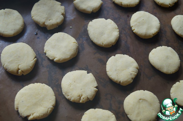 Отрываем кусочки теста, скатываем шарики и сплющиваем их, формируя круглые печенья. Сразу выкладываем на смазанный противень или силиконовый лист (не смазываем). Тесто ломкое, поэтому наши печенья по краям слегка трескаются. Не страшно.