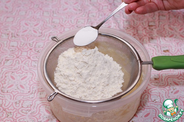Просеиваем муку и разрыхлитель, добавляем соль. Перемениваем