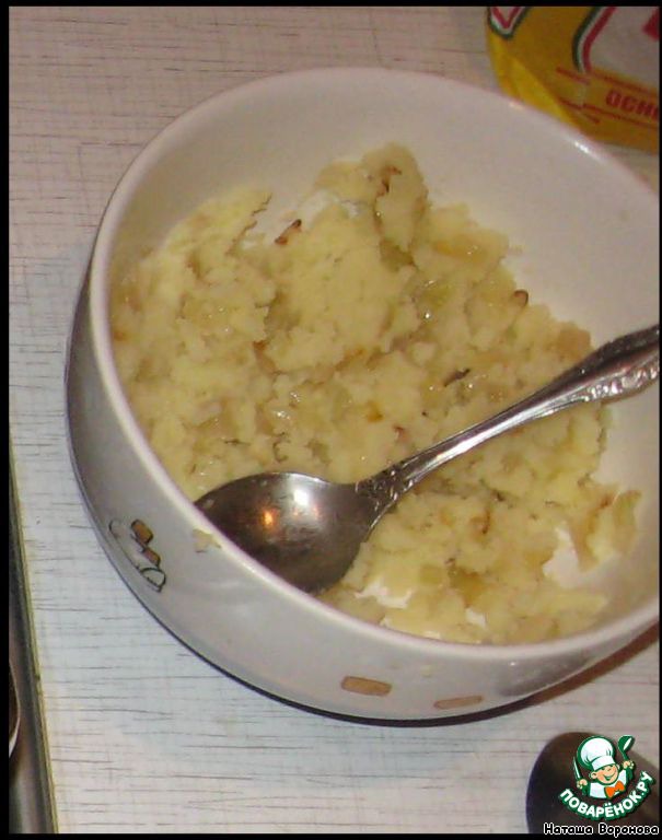 Сварите картошку, приготовьте пюре. А секретный вкус картошке придает обжаренный до золотистого цвета лук. Порежьте его мелко и обжарьте на растительном масле.