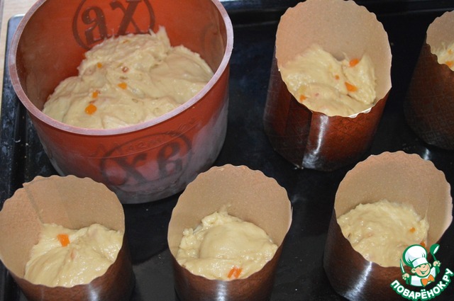 Переложить тесто в формочки заполнив их на 1/3 или 1/2, если хотите поплотнее.