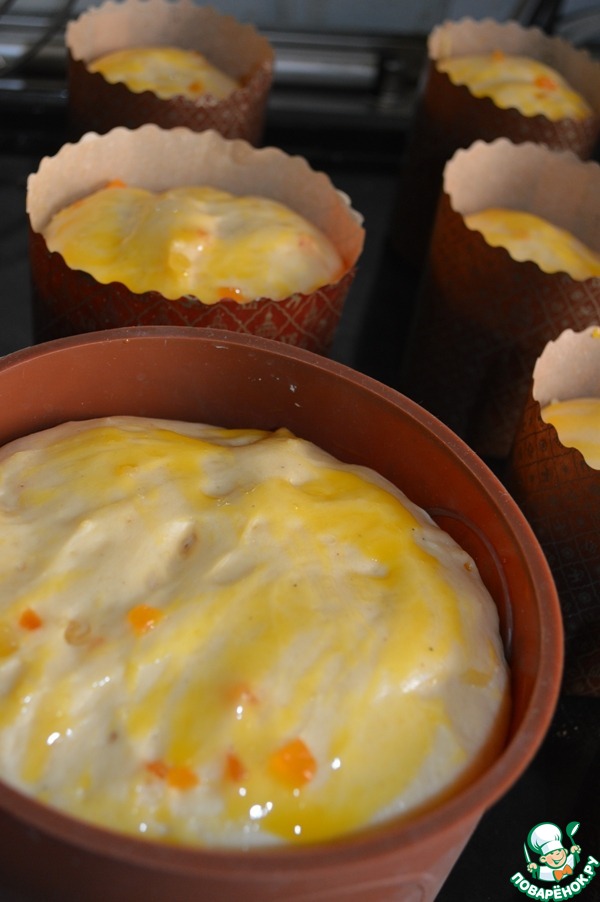 Дать куличам подняться на 3/4 высоты формы, смазать верх желтком и поставить выпекатьсяв разогретую до 160 -180 С духовку. Время выпечки зависит от формы примерно от 15-40 минут. Во время выпечки форму аккуратно поворачивать. Готовность можно проверить воткнув зубочистку.