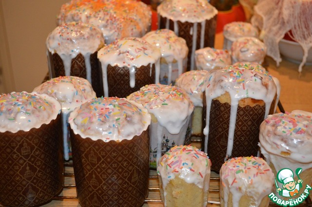 Куличи покрыть глазурью, посыпать кондитерской посыпкой и дать застыть.