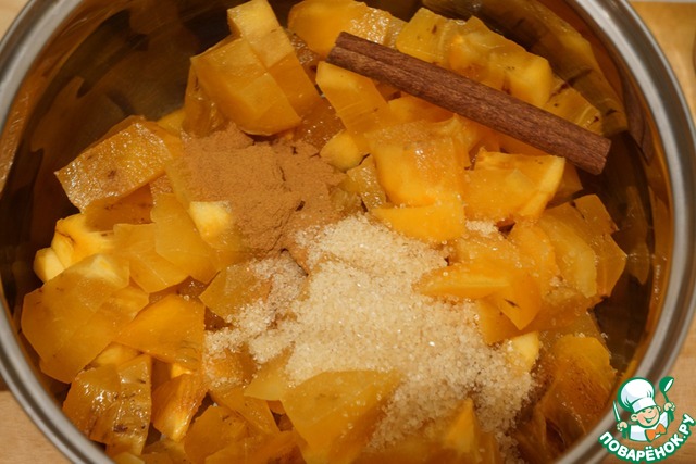 Для этого хурму очищаем, нарезаем небольшими кусочками, складываем в кастрюлю, добавляем корицу (палочку и молотую), коричневый сахар, сок лимона, воду. Доводим да кипения и провариваем в течении 10-20 минут. Время варки зависит от спелости хурмы, у меня хурма была плотная, я варила 20 минут, до её размягчения. Оставляем на ночь настаиваться.