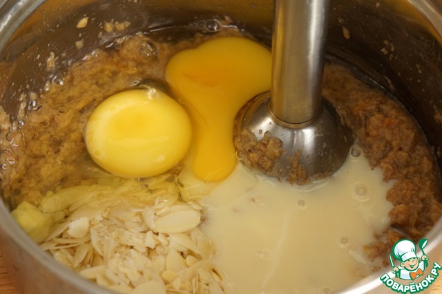 К пюре из хурмы добавляем сливки, яйца, миндальные лепестки (или муку), ванильную эссенцию, сгущенку.