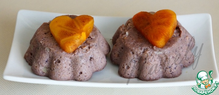 Слегка проведем ножом вдоль бортиков и перевернем формочку на тарелку. Можно полить сверху оставшейся в формочках карамелью и украсить хурмой.
