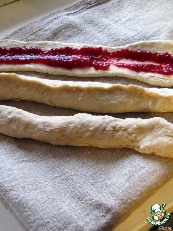 Каждую полоску смазываем джемом. Джем я чередовала - клюква, персик, клюква.