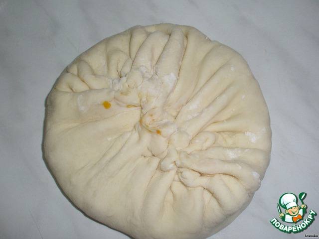 Раскатать круг, на него положить наш фарш, закрепить края.