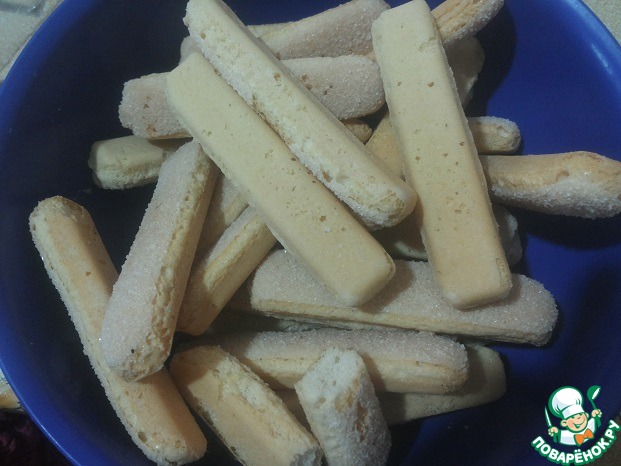 Бисквит раскрошить. У меня его в наличии не оказалось, поэтому я использовала вот такие бисквитные печенья