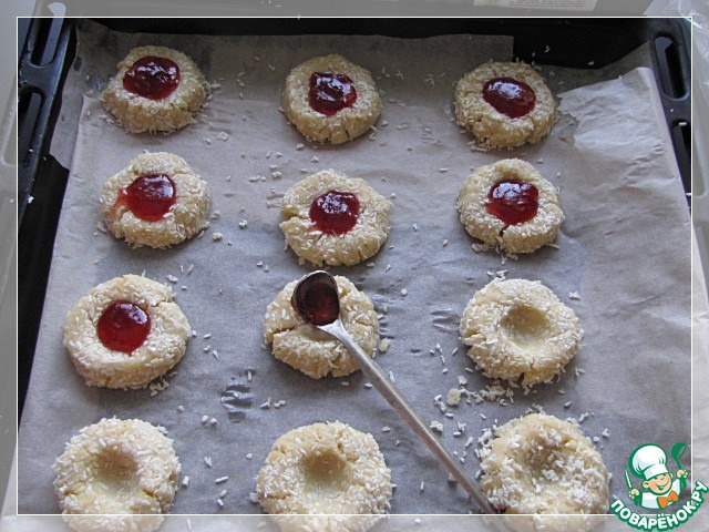 Тесто разделить на кусочки размером с грецкий орех, мокрыми руками скатать в шарики, со всех сторон обмакнуть в кокосовую стружку. Печенье приплюснуть в лепешку, выложить на противень. Кофейной ложечкой сделать вмятины посередине.