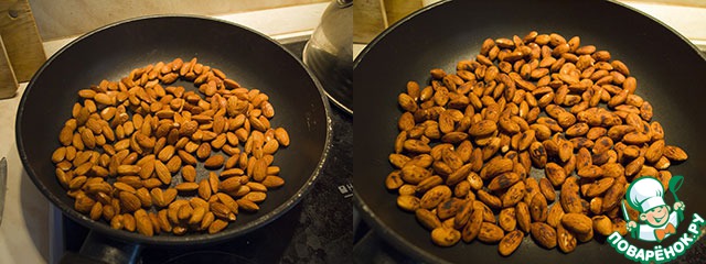 Поджариваем миндальный орех на небольшом огне, чтобы не подгорел.