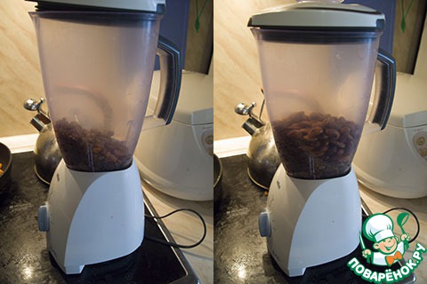 Промываем изюм и засыпаем с орехом в миксер. По объему изюма и ореха примерно одинаково.
