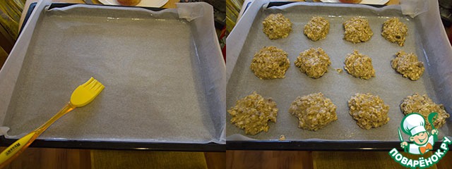 На противень стелем пергамент. Смазываем его слегка растительным или оливковым маслом. Выкладываем с помощью ложки аккуратные порции теста и слегка их сверху приминаем. Слишком близко выкладывать не нужно, так как в процессе выпекания тесто немного будет расползаться.