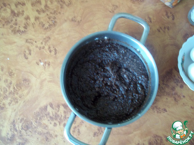 Будем "заваривать" тесто. Размолотую гречку высыпаем в кастрюльку, заливаем молоком, кладем туда же рубленый маргарин, 1.5 стакана сахарного песка, мед, какао-порошок, доводим до кипения, непрерывно помешивая, масса должна загустеть. Убираем с огня. Остужаем.